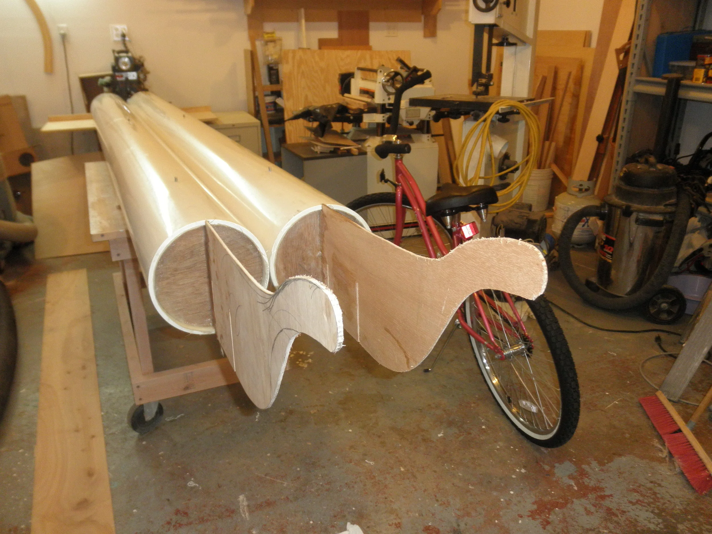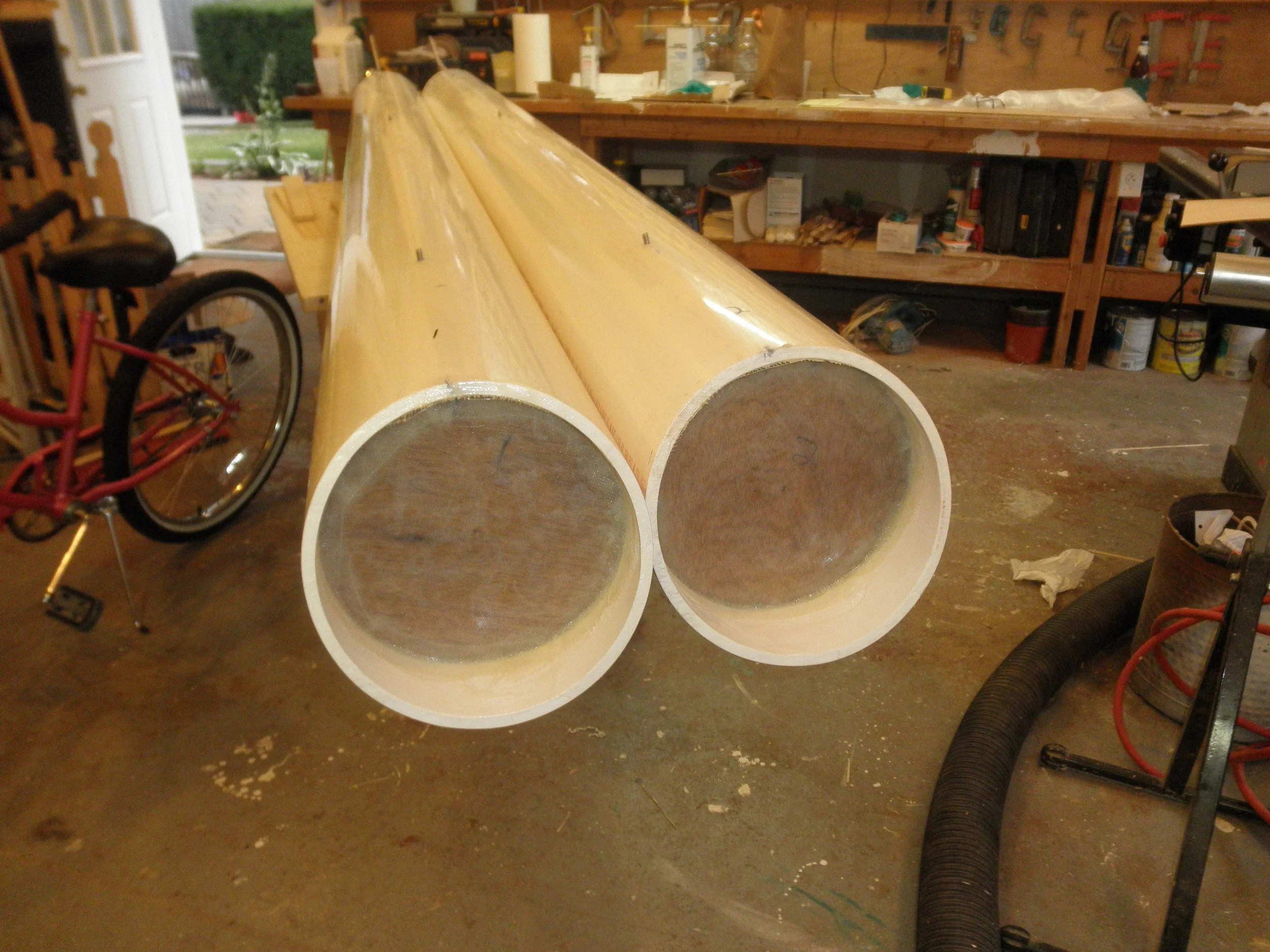 I purchased a twenty foot length of 8" PVC pipe for about $100 US. I then cut it in half. I made the cut on a slight angle so the stern could accommodate a rudder post.